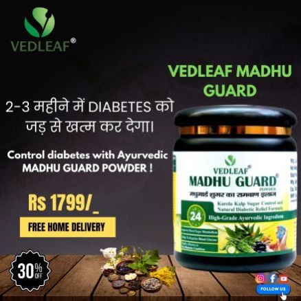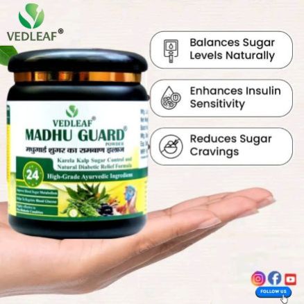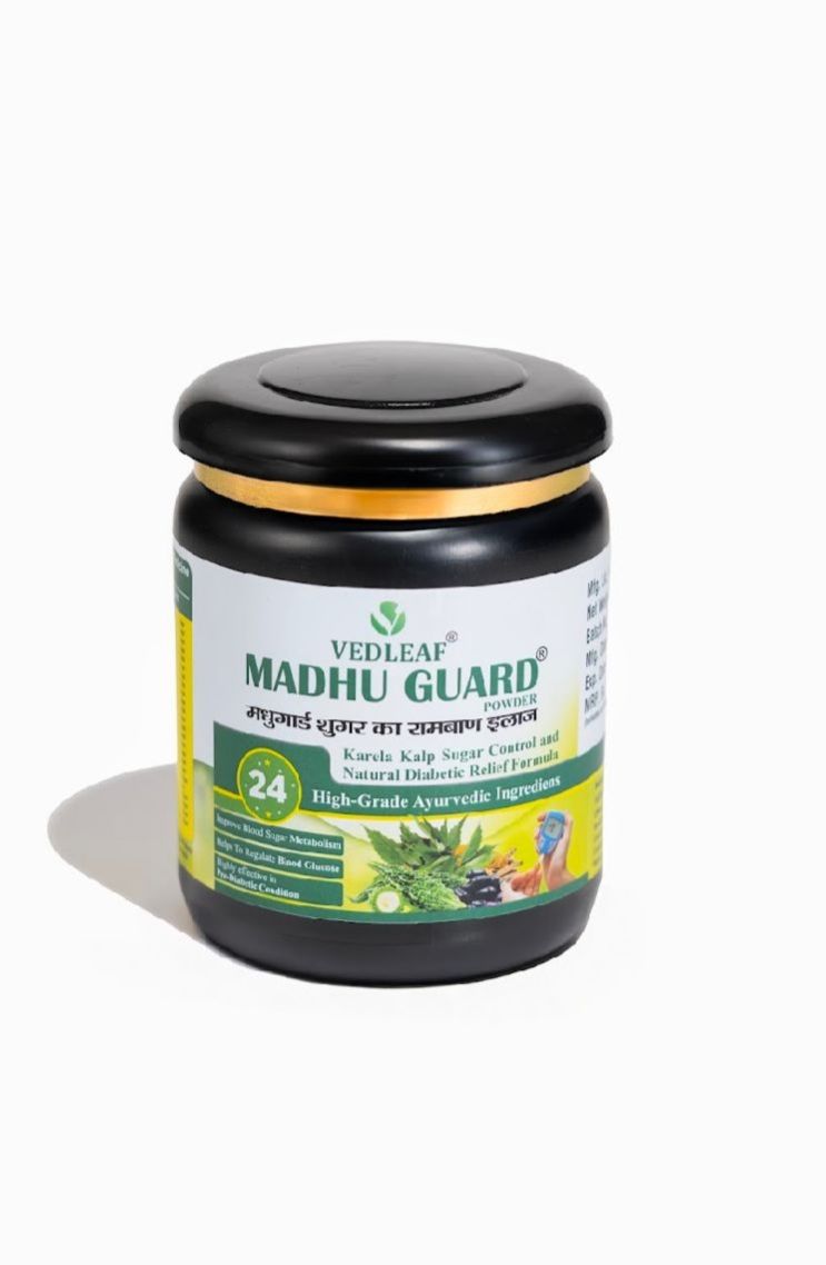 Vedleaf Madhu Guard is a high-grade Ayurvedic formulation designed to support natural sugar control and manage diabetes effectively. Enriched with 24 powerful herbs including Karela and Kalijiri, it helps regulate blood sugar levels while promoting overall wellness. Certified by AYUSH, FSSAI, ISO, GMP, and FDA-approved, this safe and natural remedy is made in India with premium quality ingredients. Suitable for long-term use, Madhu Guard is a trusted choice for those seeking holistic diabetic care. With its scientifically backed formula, it not only helps in managing sugar levels but also supports liver function and boosts immunity. Empower your health with Vedleaf Madhu Guard.