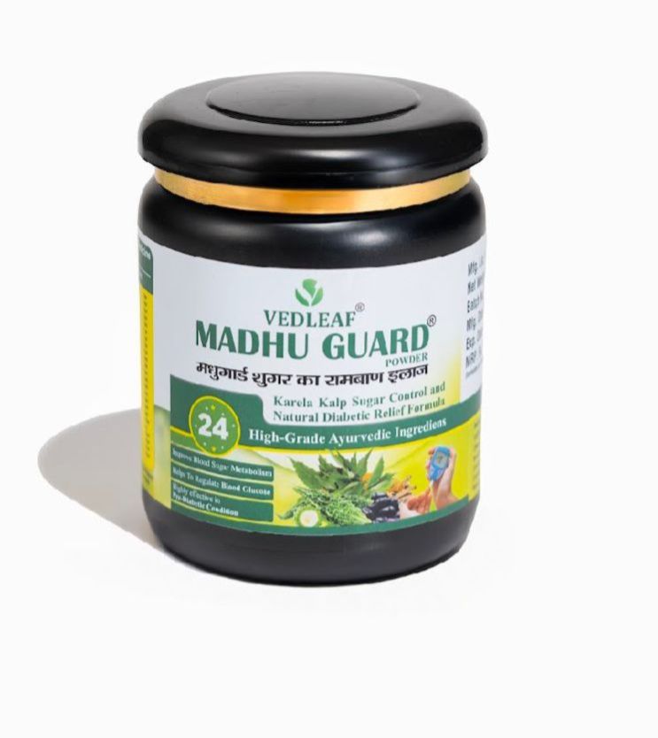 Vedleaf Madhu Guard is a high-grade Ayurvedic formulation designed to support natural sugar control and manage diabetes effectively. Enriched with 24 powerful herbs including Karela and Kalijiri, it helps regulate blood sugar levels while promoting overall wellness. Certified by AYUSH, FSSAI, ISO, GMP, and FDA-approved, this safe and natural remedy is made in India with premium quality ingredients. Suitable for long-term use, Madhu Guard is a trusted choice for those seeking holistic diabetic care. With its scientifically backed formula, it not only helps in managing sugar levels but also supports liver function and boosts immunity. Empower your health with Vedleaf Madhu Guard
